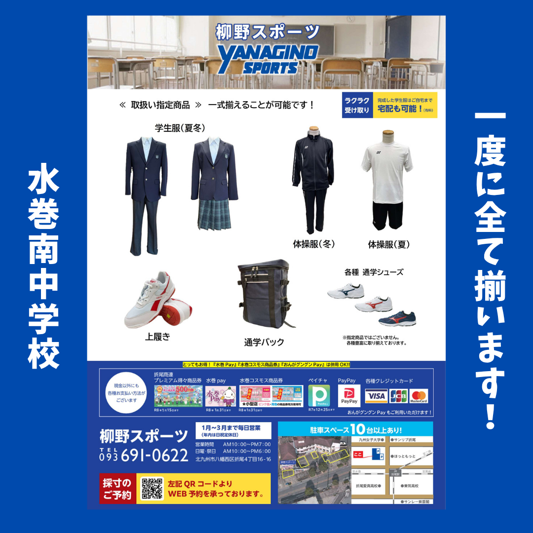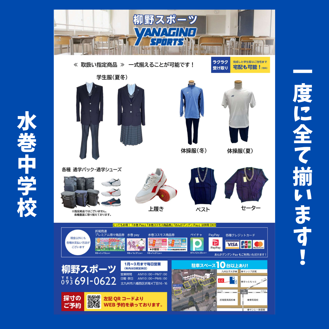 また今夏より、水巻中学校・水巻南中学校の制服ほか一式も取り扱いが始まりました!!